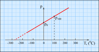 Чтобы проградуировать газовый термометр постоянного объема, можно измерить давление при двух значениях температуры (например, 0 °C и 100 °C), нанести точки p 0 и p 100 на график, а затем провести между ними прямую линию (рис. 3.2.5). Используя полученный таким образом калибровочный график, можно определять температуры, соответствующие другим значениям давления. Экстраполируя график в область низких давлений, можно определить некоторую «гипотетическую» температуру, при которой давление газа стало бы равным нулю. Опыт показывает, что эта температура равна –273,15 °С и не зависит от свойств газа. Невозможно на опыте получить путем охлаждения газ в состоянии с нулевым давлением, так как при очень низких температурах все газы переходят в жидкие или твердые состояния.