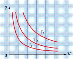 На плоскости (p, V) изотермические процессы изображаются при различных значениях температуры T семейством гипербол p ~ 1 / V, которые называются изотермами. Так как коэффициент пропорциональности в этом соотношении увеличивается с ростом температуры, изотермы, соответствующие более высоким значениям температуры, располагаются на графике выше изотерм, соответствующих меньшим значениям температуры (рис. 3.3.1). Уравнение изотермического процесса было получено из эксперимента английским физиком Р. Бойлем (1662 г.) и независимо французским физиком Э. Мариоттом (1676 г.). Поэтому это уравнение называют законом Бойля–Мариотта.