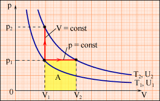 Такая неоднозначность определения теплоемкости характерна только для газообразного вещества. При нагревании жидких и твердых тел их объем практически не изменяется, и работа расширения оказывается равной нулю. Поэтому все количество теплоты, полученное телом, идет на изменение его внутренней энергии. В отличие от жидкостей и твердых тел, газ в процессе теплопередачи может сильно изменять свой объем и совершать работу. Поэтому теплоемкость газообразного вещества зависит от характера термодинамического процесса. Обычно рассматриваются два значения теплоемкости газов: C V – молярная теплоемкость в изохорном процессе (V = const) и C p – молярная теплоемкость в изобарном процессе (p = const).