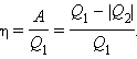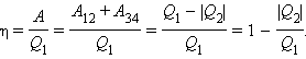 Работа A, совершаемая рабочим телом за цикл, равна полученному за цикл количеству теплоты Q. Отношение работы A к количеству теплоты Q 1, полученному рабочим телом за цикл от нагревателя, называется коэффициентом полезного действия η тепловой машины:
