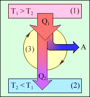 | Рисунок 3.11.2. Энергетическая схема тепловой машины: 1 – нагреватель; 2 – холодильник; 3 – рабочее тело, совершающее круговой процесс. Q 1 > 0, A > 0, Q 2 < 0; T 1 > T 2. |