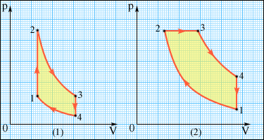 В применяемых в технике двигателях используются различные круговые процессы. На рис. 3.11.3 изображены циклы, используемые в бензиновом карбюраторном двигателе и в дизельном двигателе. В обоих случаях рабочим телом является смесь паров бензина или дизельного топлива с воздухом. Цикл карбюраторного двигателя внутреннего сгорания состоит из двух изохор (1–2, 3–4) и двух адиабат (2–3, 4–1). Дизельный двигатель внутреннего сгорания работает по циклу, состоящему из двух адиабат (1–2, 3–4), одной изобары (2–3) и одной изохоры (4–1). Реальный коэффициент полезного действия у карбюраторного двигателя порядка 30%, у дизельного двигателя – порядка 40 %.