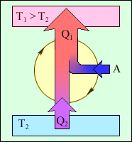 | Рисунок 3.11.5. Энергетическая схема холодильной машины. Q 1 < 0, A < 0, Q 2 > 0, T 1 > T 2. |