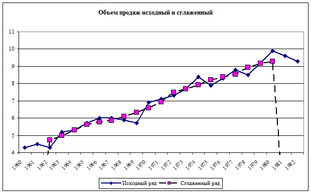 Рис. 8.1. Объем продаж исходный и сглаженный
