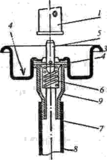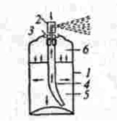 На рис. 5 показан корпус пружинного клапана, который герметично крепится к баллону с помощью резиновой прокладки (3,4). При нажатии на распылитель (1) вместе с ним движется вниз шток (5), сжимая пружину (6). Отверстие в штоке выходит из-под резиновой манжеты (9) в полость корпуса клапана (2). Содержимое баллона под давлением газовой фазы пропеллента поступает по сифонной трубке (7,8) в отверстие штока и далее в распылитель. При освобождении распылителя пружина поднимает шток вверх и действие клапана прекращается.