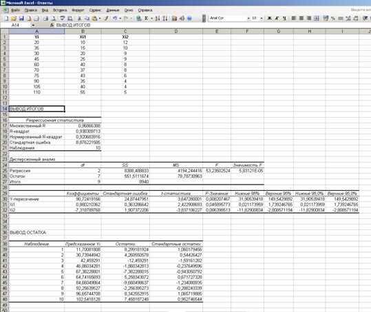 д) Коэффициент детерминации равен 0,94 (в блоке Регрессионная статистика он называется R-квадрат). Это означает, что наша модель объясняет 94% общего разброса значений результативного признака. Скорректированный (нормированный) коэффициент детерминации равен 0,92. Это означает, что наша модель объясняет 92% общего разброса значений результативного признака с учетом поправки на число степеней свободы.