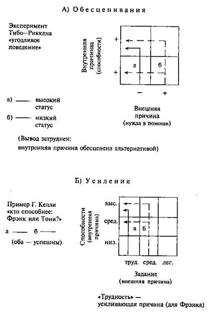 Этот же эффект был установлен и относительно статуса человека: один тип объяснения давался для высокостатусного и другой тип — для низкостатусного. Это подтверждено в эксперименте Тибо и Рик-кена (1995): «наивному субъекту» предъявляются два «конфедерата» (лица, находящиеся в сговоре с экспериментатором). Один из них парадно одет, о нем сказано, что он только что защитил диссертацию. Другой одет кое-как, и сказано, что он студент первого курса. Экспе-риментатор дает «наивному субъекту» задание — произнести речь в пользу донорства и убедить двух «конфедератов» тотчас же сдать кровь в качестве доноров. «Конфедераты» слушают речь и вскоре сообщают, что они убедились и идут сдавать кровь. Тогда экспериментатор про-сит «наивного» объяснить, почему они так поступают? Ответ разли-чен в двух случаях: «наивный» полагает, что защитивший диссерта-цию, по-видимому, высокосознательный гражданин и сам принял такое решение, студент-первокурсник же принял такое решение, конечно, под влиянием «речи», то есть воздействия со стороны «наи-вного». Локус причинности в первом случае внутренний, во втором — внешний. Очевидно, такое распределение локусов связано со стату-сом воспринимаемого лица.