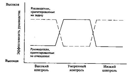 Согласно «вероятностной модели» руководители с низкой оцен-кой НПС более эффективны в сильно и слабо контролируемых ими ситуациях (т.е. при соответственно высоком и низком СК), а руково-дители с высокой оценкой НПС наиболее эффективны в умеренно контролируемых ими ситуациях (т.е. при умеренном СК). Иными сло-вами, связь между личностной (или личностно-стилевой) ориентаци-ей руководителя (репрезентированной оценкой НПС) и его эффек-тивностью носит вероятностный характер, будучи обусловленной сте-пенью его контроля над ситуацией. Эти постулаты модели графически отображены на рис. 1.