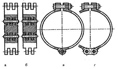 Рассмотрим пример унификации тяговой цепи конвейера (рис. 8.3). Цепь составлена из звеньев двух типов (рис. 8.3,а). В рациональной конструкции (рис. 8.3,б) звенья унифицированы. Стяжной хомут (рис. 8.3,в) состоит из двух трудоемких деталей. Использование соединительной серьги (рис. 8.3, г) позволяет сделать половины хомута одинаковыми.