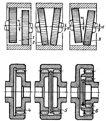 В агрегатированных системах с механическим приводом большое значение имеет конструкция соединений, передающих крутящий момент. Соединение должно компенсировать продольные смещения, несоосность е и угловые переносы α соединяемых агрегатов (рис.8.9,1...3).
