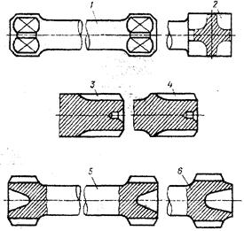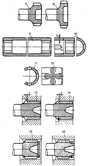 Для передачи небольших крутящих моментов применяют упрощенные конструкции с квадратными 1 или трефными 2 хвостовиками. Значительно прочнее торсионы с эвольвентными шлицами 3...8. Конструкция 3 нецелесообразна вследствие неравнопрочности шлицев и стержня, что обуславливает малую упругость торсиона. Равнопрочными являются конструкции 4...6. Увеличение диаметра шлицев в конструкции 7...8 снижает нагрузку на шлицы и позволяет уменьшить их длину с выигрышем в компенсирующей способности торсиона. При заданной компенсирующей способности увеличение диаметра позволяет уменьшить зазор в шлицах, что улучшает условия их работы и повышает долговечность соединения. Трубчатые торсионы 9 отличаются повышенной крутильной жесткостью и применяются только как компенсаторы, амортизирующая их способность незначительна. Резко увеличивают упругость трубчатых торсионов продольные пазы 10...11. В специальных случаях применяют торсионы крестообразного сечения 12, обладающие высокой упругостью.