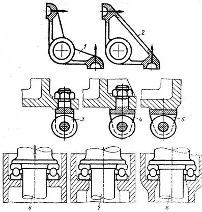 На рис. 8.12 приведены примеры полного или частичного устранения изгиба. Плечи углового рычага 1 испытывают изгиб от действия сил, приложенных к крайним точкам. Введение таврового ребра между концами рычага 2 ликвидирует изгиб.
