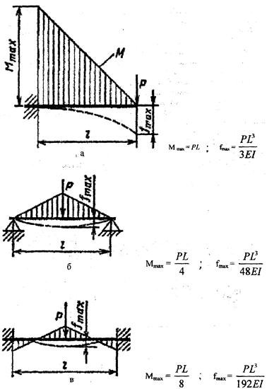 Из сопоставления величин максимальных изгибающих моментов (Мmax) и прогибов (fmax) видно преимущество двухопорных балок перед консольной по жесткости и прочности. При одинаковых длине, сечении балок и нагрузке максимальный изгибающий момент (а следовательно, и максимальное напряжение изгиба) в двухопорной балке в 4 раза, а с заделанными концами - в 8 раз меньше, чем в консольной. Еще больше преимущество по жёсткости. Максимальный прогиб двухопорной балки в 16 раз, а двухопорной заделанной - в 64 раза меньше консольной.