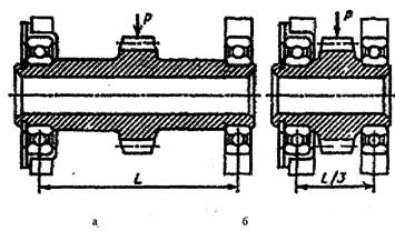 На рис.9.14 показана двухопорная установка зубчатого колеса. При диаметре вала d=40мм, длине l=200мм и нагрузке Р=100 кН прогиб вала в конструкции (рис. 8.14,а) достигает относительно большой величины (f=0,1мм), не безразличной для зубчатого соединения, т.е. работы зубьев колес.