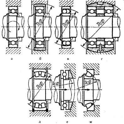 Однако нужно иметь в виду, что сферические двухрядные подшипники обладают пониженной нагружаемостью по сравнению с однорядными радиальными подшипниками, так как вследствие неблагоприятной для контактной прочности формы наружных беговых дорожек они не приспособлены для несения значительных осевых сил. Поэтому в узлах, воспринимающих повышенную осевую нагрузку, предпочтительнее применять однорядные подшипники (рис. 8.19, г) на сферических опорах или двухрядные самоустанавливающиеся подшипники (рис.8.19,д) с цилиндрическими телами качения (роликами).