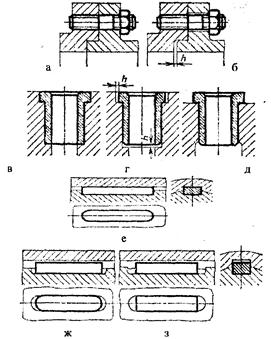 Грубые ошибки, подобные приведенным на рис.8.23,а,в,д, допускаются редко. Чаще встречаются ошибки, заключающиеся во введении излишней подгонки, излишнего центрирования и т.п. Например, подгонка призматической шпонки к шпоночному пазу по всему контуру (рис.8.23,е) намного осложняет этот процесс. Значительно проще и правильно подгонять шпонку только по рабочим граням, оставляя зазоры по торцам шпонки и между верхней плоскостью шпонки и днищем канавки (рис.8.23, ж, з).