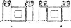Расчленение позволяет в некоторых случаях значительно уменьшить трудоёмкость изготовления крупногабаритных литых корпусных деталей. Так, конструкция станины с подшипниками под продольные валы (рис.8.27,а) нетехнологична, в ней нижние половины корпусов подшипников отлиты заодно со станиной, и при установке подшипников необходимо совместное растачивание цилиндрических отверстий в крышках и станине с соблюдением параллельности осей отверстий. Обработка, особенно затруднительна в случае, если подшипники, расположенные в линию, находятся на значительном расстоянии один от другого,