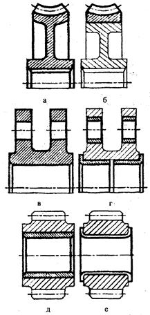 Если же применения дефицитных цветных сплавов избежать нельзя, то следует сокращать их расход до минимума. В качестве примера приведём корпус с многочисленными поверхностями трения (центральное отверстие и отверстия в проушинах). В конструкции (рис.8.29,в) корпус выполнен целиком из антифрикционной бронзы, а в рациональной конструкции (рис.8.29,r) – из чугуна (или другого недефицитного материала); поверхности трения образованы бронзовыми втулками.