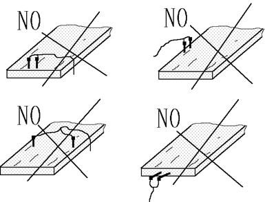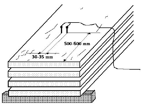 6) Точки измерения должны быть расположены на расстоянии приблизительно 600-400 мм от торцов и на 1\3 ширины доски (посередине при сушке узких досок) (рис.19) Категорически запрещается устанавливать электроды на торцах штабелей (рис.20). Пустые пространства между электродами при необходимости закрываются силиконовой мастикой или твердым воском во избежание накопления воды. Удобно устанавливать электроды на нижней поверхности доски – это исключает любой контакт с водой.