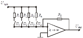 В зависимости от цифровой величины через электронный переключатель включаются соответствующие регистры R1 и R4 . В результате получается Rобщ.. и выходная аналоговая величина: