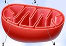 Митохондрия: 1 — наружная мембрана; 2 — внутренняя мембрана; 3 — кристы; 4 — матрикс.