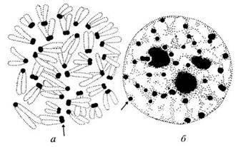При подготовке клетки к делению в ядре происходит спирализация хроматиновых фибрилл и превращение хроматина в хромосомы. После деления в ядрах дочерних клеток происходит деспирализация хроматиновых фибрилл и хромосомы снова преобразуются в хроматин. Следовательно, хроматин и хромосомы представляют собой различные фазы одного и того же вещества.