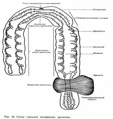 При микроскопическом анализе хромосом прежде всего видны различия их по форме и величине. Строение каждой хромосомы сугубо индивидуальное. Можно заметить также, что хромосомы обладают общими морфологическими признаками. Они состоят из двух нитей — хроматид, расположенных параллельно и соединенных между собой в одной точке, названной центромерой или первичной перетяжкой. На некоторых хромосомах можно видеть и вторичную перетяжку. Она является характерным признаком, позволяющим идентифицировать отдельные хромосомы в клетке. Если вторичная перетяжка расположена близко к концу хромосомы, то дистальный участок, ограниченный ею, называют спутником. Хромосомы, содержащие спутник, обозначаются как АТ-хромосомы. На некоторых из них в тело-фазе происходит образование ядрышек.