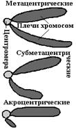 Участок хрома-тиды (хромосомы) от теломеры до центромеры называют плечом хромосомы. Каждая хромосома имеет два плеча. В зависимости от соотношения длин плеч выделяют три типа хромосом: 1) мета-центрические (равноплечие); 2) субметацентрические (неравноплечие); 3) акроцентрические, у которых одно плечо очень короткое и не всегда четко различимо.