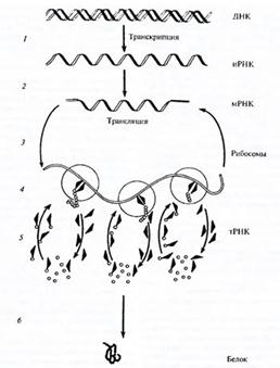Рис 4.2. Схема биосинтеза белка (по Л.С. Спирину, 1986): 1 –синтез иРНК (транскрипции). 2–3 – иРНК проходит через поры ядерной мембраны к рибосомам (трансляции), 4 – аминокислоты, соединяясь в определенной последовательности, из РНК образуют фермент, 5–6 – образование белка