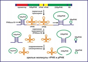 Синтез предшественников рРНК и тРНК сходен с синтезом ире-мРНК. Первичный транскрипт рибосомных РНК не содержит интронов, и при действии специфических РНКаз расщепляется с образованием 28S-, 18S- и 5,8S-pPHK; 5S-pPHK синтезируется при участии РНК-полимеразы III.