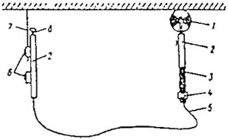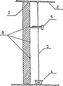 1 - стена, перегородка или колонна; 2 - перекрытие; 3 - отвес; 4 - сосуд с водой; 5 - измерительная линейка; 6 - точка измерения