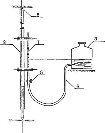 1 - градуированная трубка; 2- телескопическая стойка; 3- сосуд; 4- резиновый шланг; 5 - краник; 6 - точка измерения