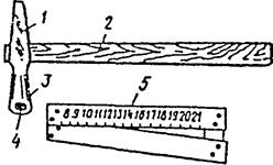 1 - молоток; 2 - ручка; 3 - сферическое гнездо; 4 - шарик; 5 - угловой масштаб
