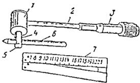1 - корпус, 2 - метрическая рукоятка; 3 - резиною ручка; 4 - головка; 5 - стальной шарик, 6 - стальной эталонный стержень; 7 - угловой масштаб