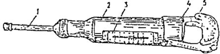 1 - ударник, 2 - корпус, 3 - шкала, 4 - фиксатор показания прибора, 5 - рукоятка