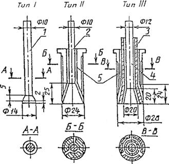 1 - рабочий стержень; 2 - рабочий стержень с разжимным конусом; 3 - рабочий стержень с полным разжимным конусом; 4 - опорный стержень, 5 - сегментные рифленые щеки