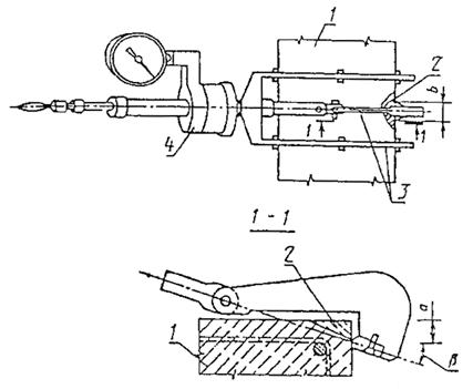 1 - испытуемая конструкция, 2 - скалываемый бетон, 3 - устройство УРС, 4 - прибор ГПНС-4