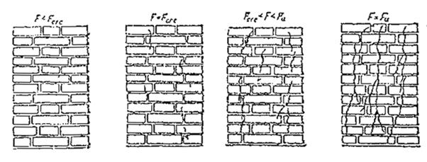 В кладках из крупноразмерных изделий (высокопустотных керамических камней, камней из ячеистого бетона) наступает хрупкое разрушение, первые трещины появляются при нагрузках 0,85-1 от разрушающей.