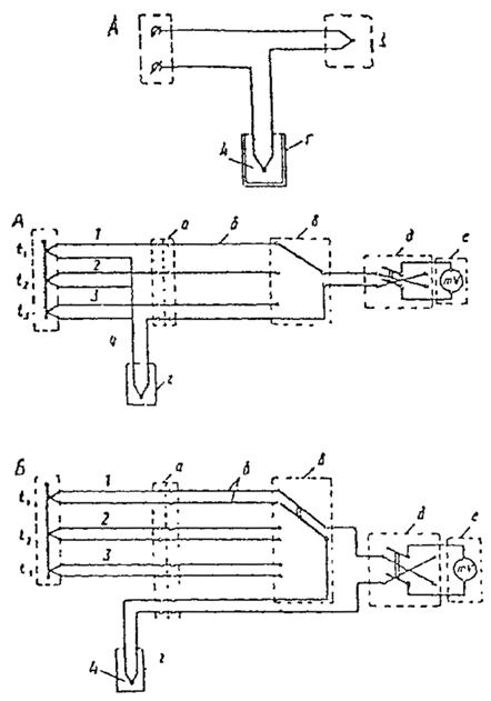 А - однопроводная; Б - двухпроводная, 1, 2, 3 - рабочие спаи термопар;4 - свободный спай термопар; а - штепсельный разъем типа ШР; б - соединительные (медные) провода; в - переключатель; г - термостатирующий сосуд; д - переключатель полярности; е - потенциометр типа ПП
