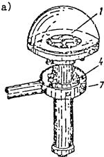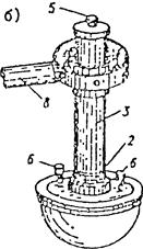 а - положение приемником вверх; б – то же, вниз; 1 - головка пиранометра; 2 - втулка; 3 - трубка; 4 - муфта; 5 - стержень, по которому скользит груз; 6 - клеммы; 7 - карданный подвес; 8 - рукоятка