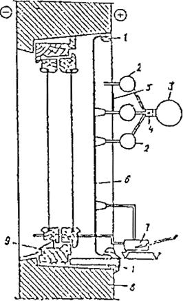 1 - поток воздуха через рабочую обойму; 2 - поток воздуха через защитную обойму; 3 - защитная обойма; 4 - рабочая обойма; 5 – термометр; 6 – расходомер; 7 - регулятор расхода; 8 – пылесос; 9 - микрометр