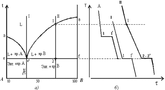 Рис. 5.3. Диаграмма состояния сплавов с отсутствием растворимости компонентов в твердом состоянии (а) и кривые охлаждения сплавов (б)