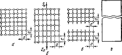 Рис.6.3. Схема упругой деформации и хрупкого разрушения под действием упругих напряжений а – ненапряженная решетка металла; б – упругая деформация; в, г – хрупкое разрушение в результате отрыва
