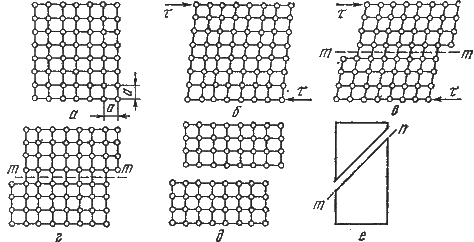 Рис.6.4. Схема пластической деформации и вязкого разрушения под действием касательных напряжений а – ненапряженная решетка; б – упругая деформация; в – упругая и пластическая деформация; г – пластическая деформация; д, е – пластичное (вязкое) разрушение в результате среза