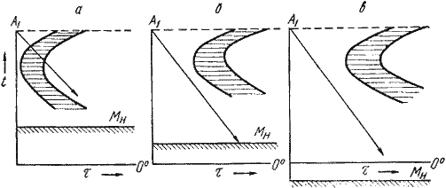 Рис.17.3. Диаграммы изотермического распада аустенита для сталей перлитного (а), мартенситного (б) и аустенитного (в) классов