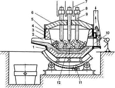 Дуговая печь питается трёхфазным переменным током. Имеет три цилиндрических электрода 9 из графитизированной массы, закреплённых в электрододержателях 8, к которым подводится электрический ток по кабелям 7. Между электродом и металлической шихтой 3 возникает электрическая дуга. Корпус печи имеет форму цилиндра. Снаружи он заключён в прочный стальной кожух 4, внутри футерован основным или кислым кирпичом 1. Плавильное пространство ограничено стенками 5, подиной 12 и сводом 6. Съёмный свод 6 имеет отверстия для электродов. В стенке корпуса рабочее окно 10 (для слива шлака, загрузки ферросплавов, взятия проб), закрытое при плавке заслонкой. Готовую сталь выпускают через сливное отверстие со сливным желобом 2. Печь опирается на секторы и имеет привод 11 для наклона в сторону рабочего окна или желоба. Печь загружают при снятом своде.