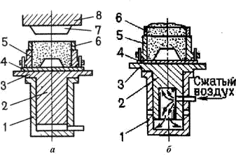 Под действием сжатого воздуха, подаваемого в нижнюю часть цилиндра 1, встряхивающий поршень 2 и стол с закрепленной на нем модельной плитой 4 с моделью поднимается на 30…100 мм до выпускного отверстия, затем падает. Формовочная смесь в опоке 5 и наполнительной рамке 6 уплотняется в результате появления инерционных сил. Способ характеризуется неравномерностью уплотнения, уплотнение верхних слоев достигается допрессовкой.