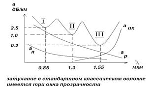 Видно, что в используемой полосе частот (длин волн) имеются три окна прозрачности: при длинах волн 0.85, 1.3 и 1.55 мкм. Увеличение затухания при длинах волн 1.2 и 1.4 мкм происходит из-за наличия в кварце ионов гидроксильной группы ОН.