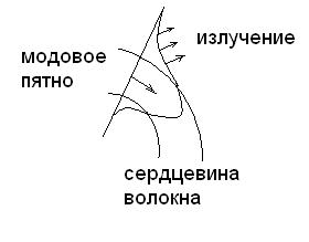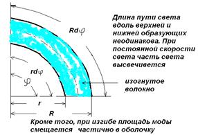 При изгибе волокна возникает дополнительное затухание, вследствие того, что длина пути вдоль верхней и нижней образующих волокна неодинаковы (рис.3.4). Так как скорость света постоянна, то “излишки” света высвечиваются.