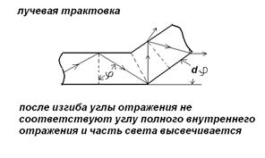 Кроме того, при изгибе изменяется угол отражения проходящих лучей, так что многие из них уже не удовлетворяют условию полного внутреннего отражения (Рис.3.5).